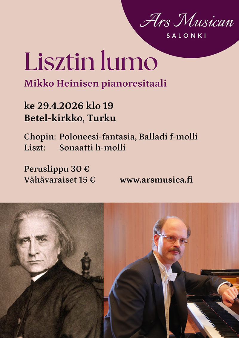 Mikko Heininen esittää pianoresitaalin, jossa kuullaan järkälemäinen LIsztin h-mollisonaatti. Lisäksi ohjelmistossa on Chopinin keskeisiä teoksia.